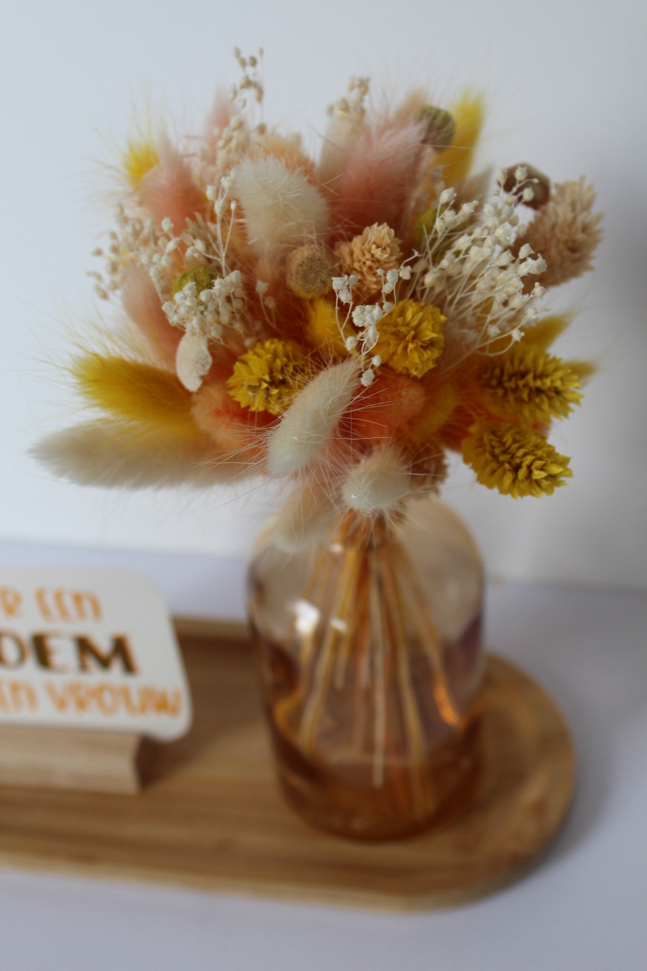 Wat dit plankje extra bijzonder maakt? Je kiest zelf de kleuren droogbloemen en vaasje! – stel het helemaal samen naar jouw smaak of passend bij de ontvanger.