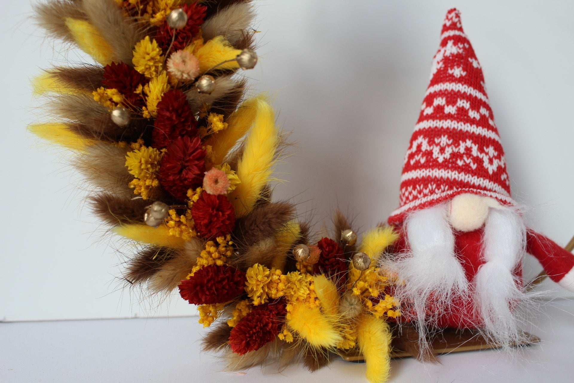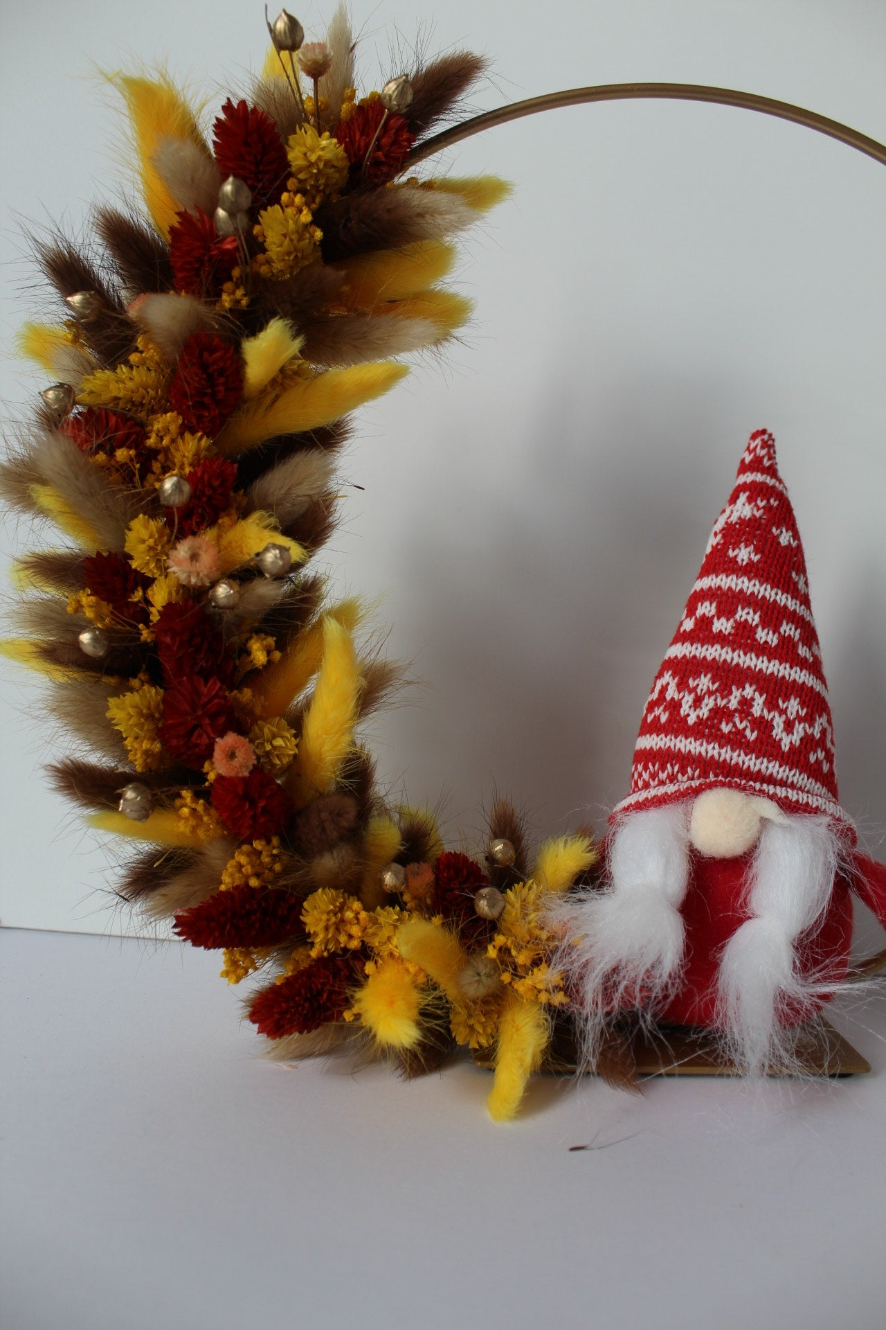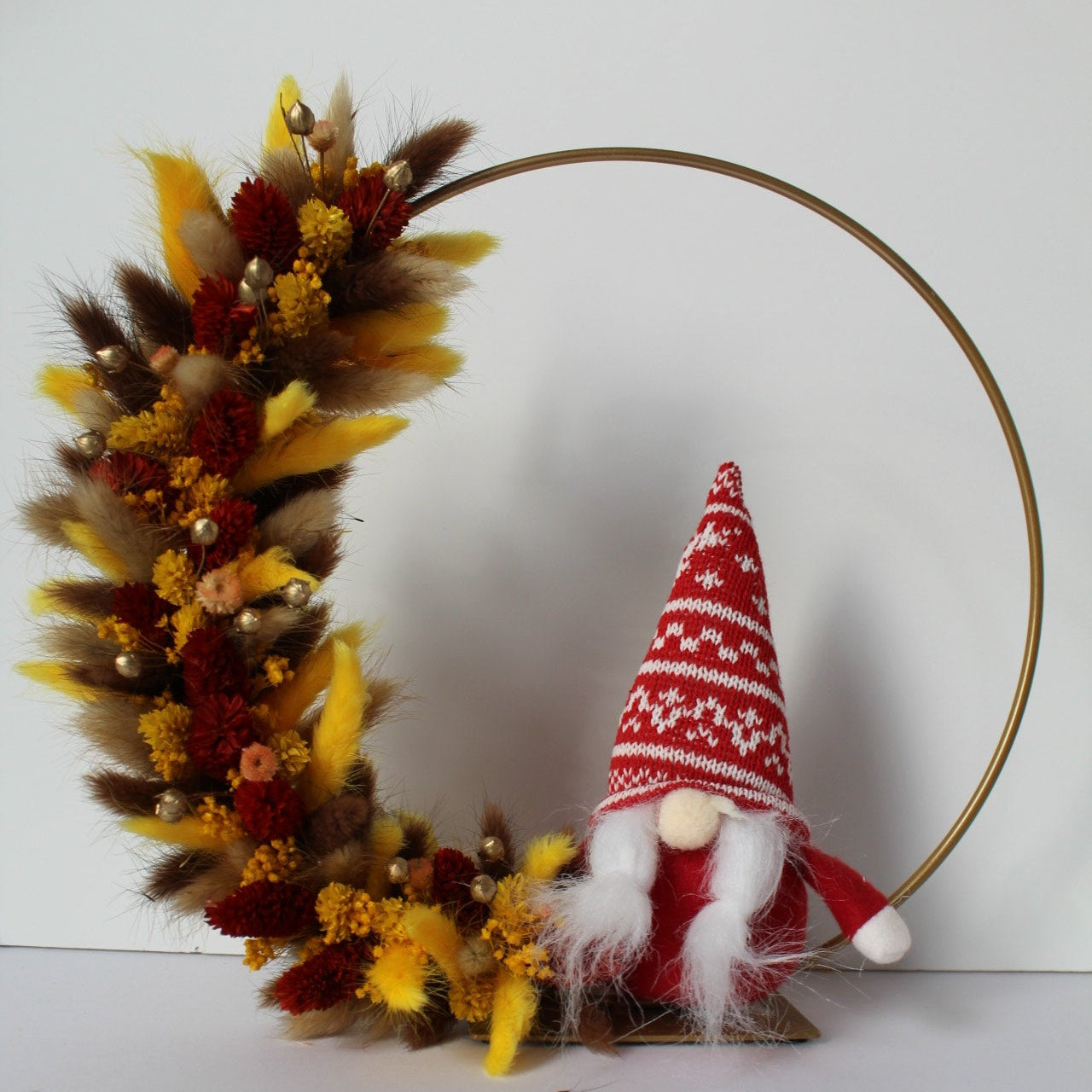 Sfeervolle cirkel flowerhoop, met grappige gnoom – perfect voor de feestdagen of als uniek cadeau. Een echte eyecatcher vol warmte en charme!