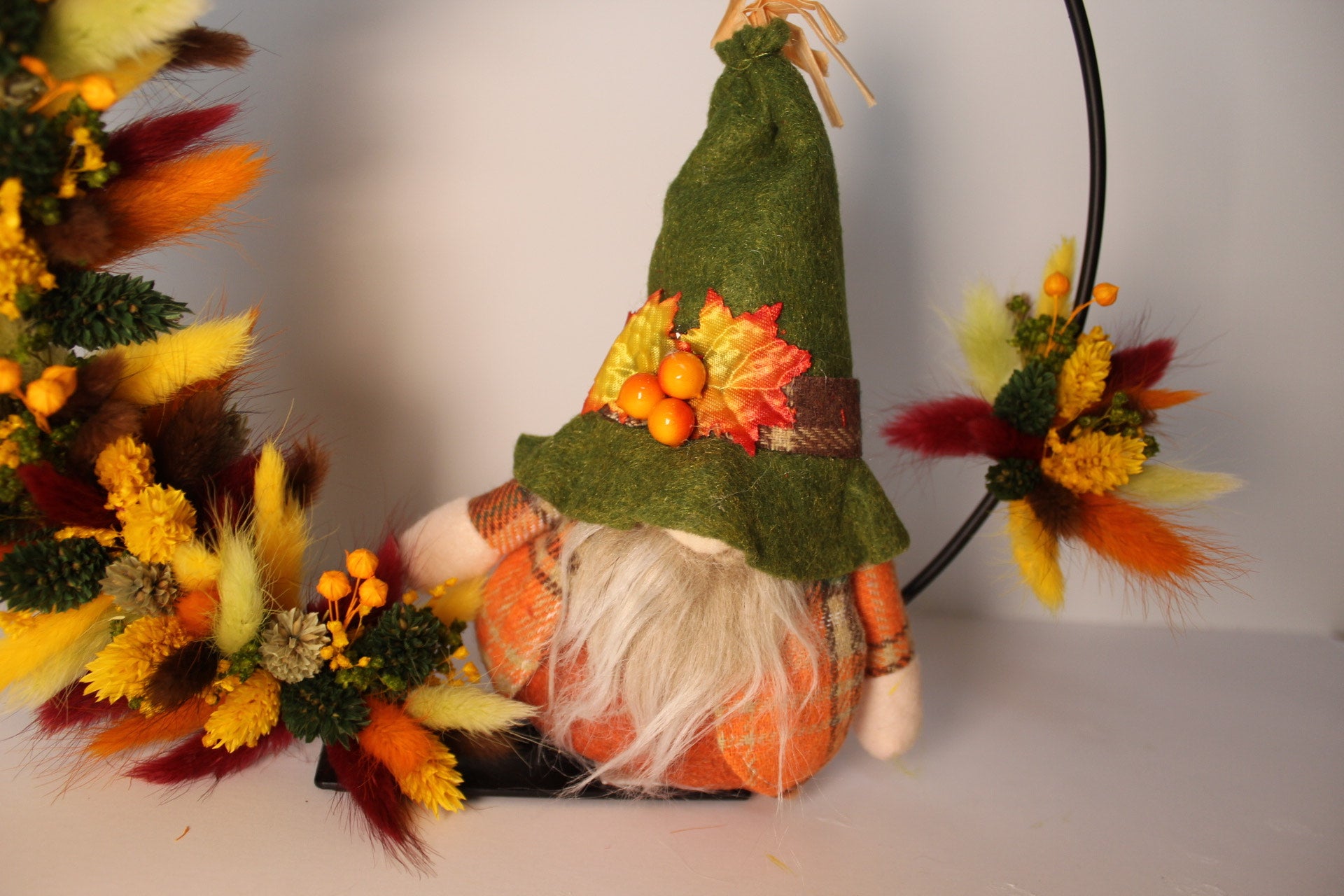 Deze flowerhoop is perfect voor de herfst, gemaakt met droogbloemen in warme herfstkleuren. Een inspirerende gnoom maakt het geheel extra gezellig en sfeervol voor het seizoen.