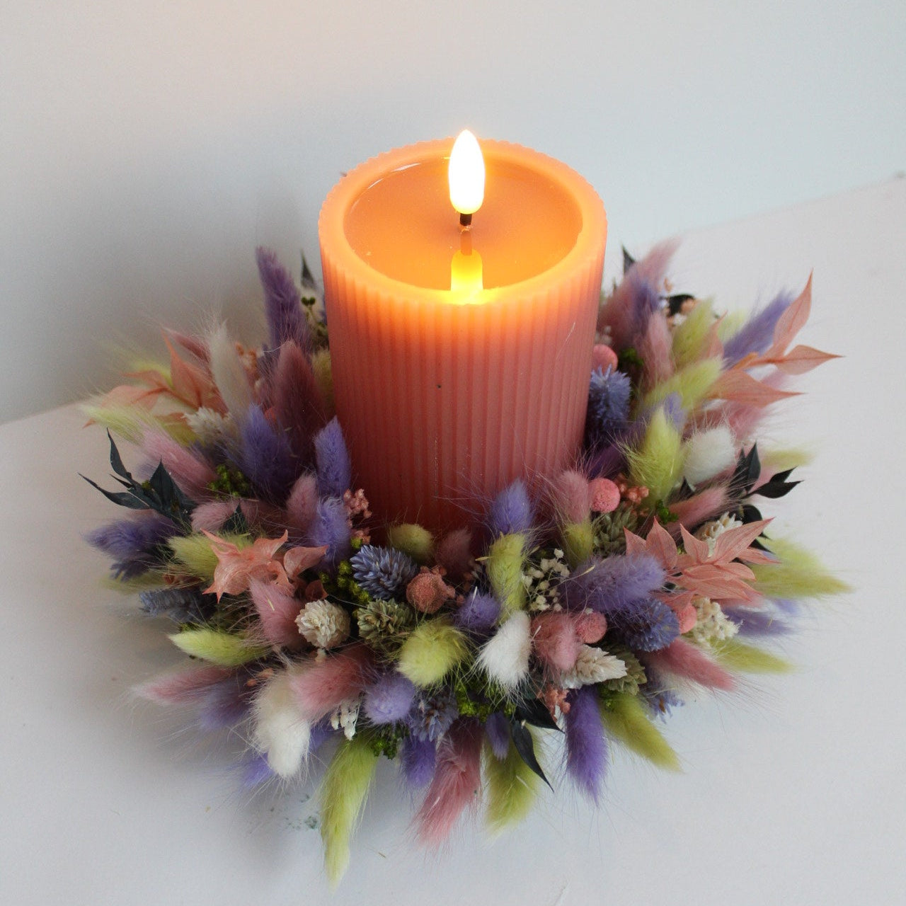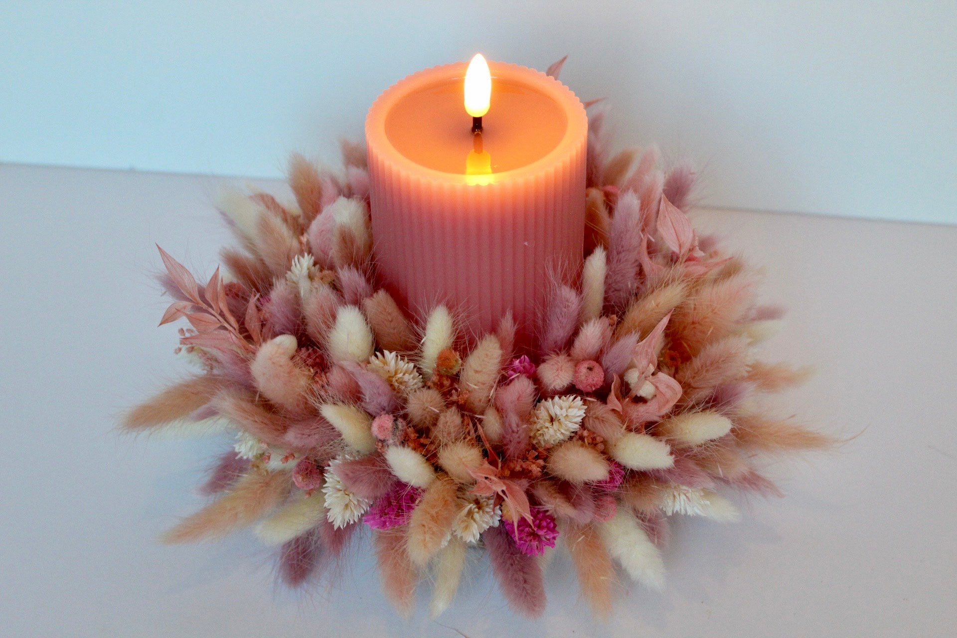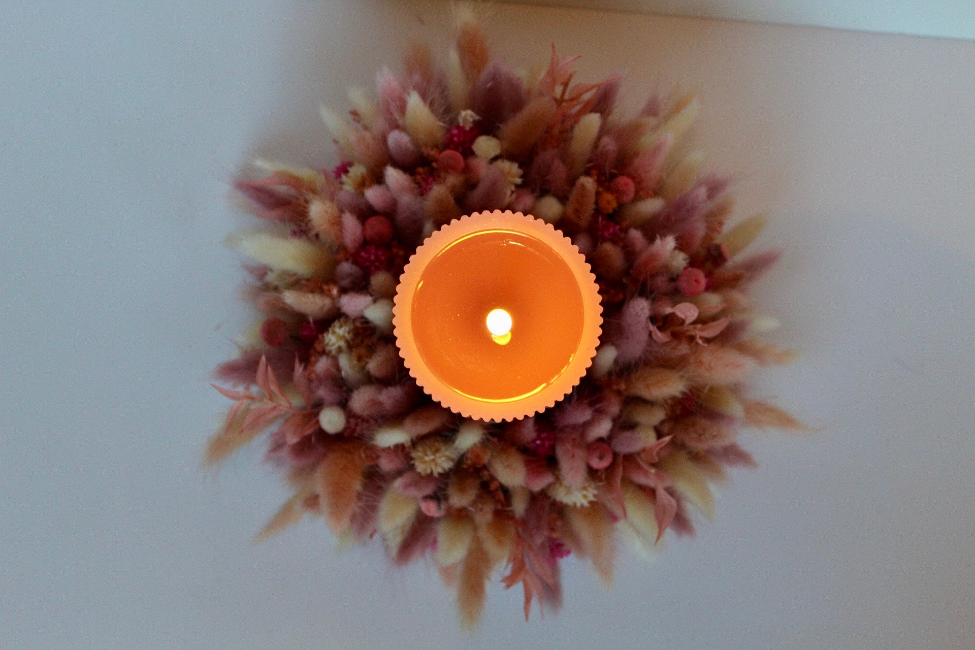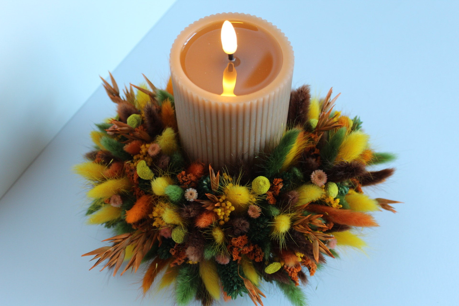 Kaars in droogbloemen, een sfeervolle kaars omringd door met zorg geselecteerde en handgeschikte gedroogde bloemen. Dit bloemstuk brengt warmte, rust en een vleugje natuurlijke charme in huis. Perfect als tafeldecoratie, cadeau of om een gezellig hoekje extra bijzonder te maken. De bloemen verwelken niet en de kaars is eenvoudig te vervangen, waardoor je er lang van kunt genieten.