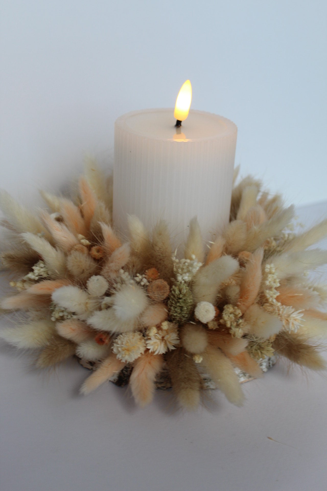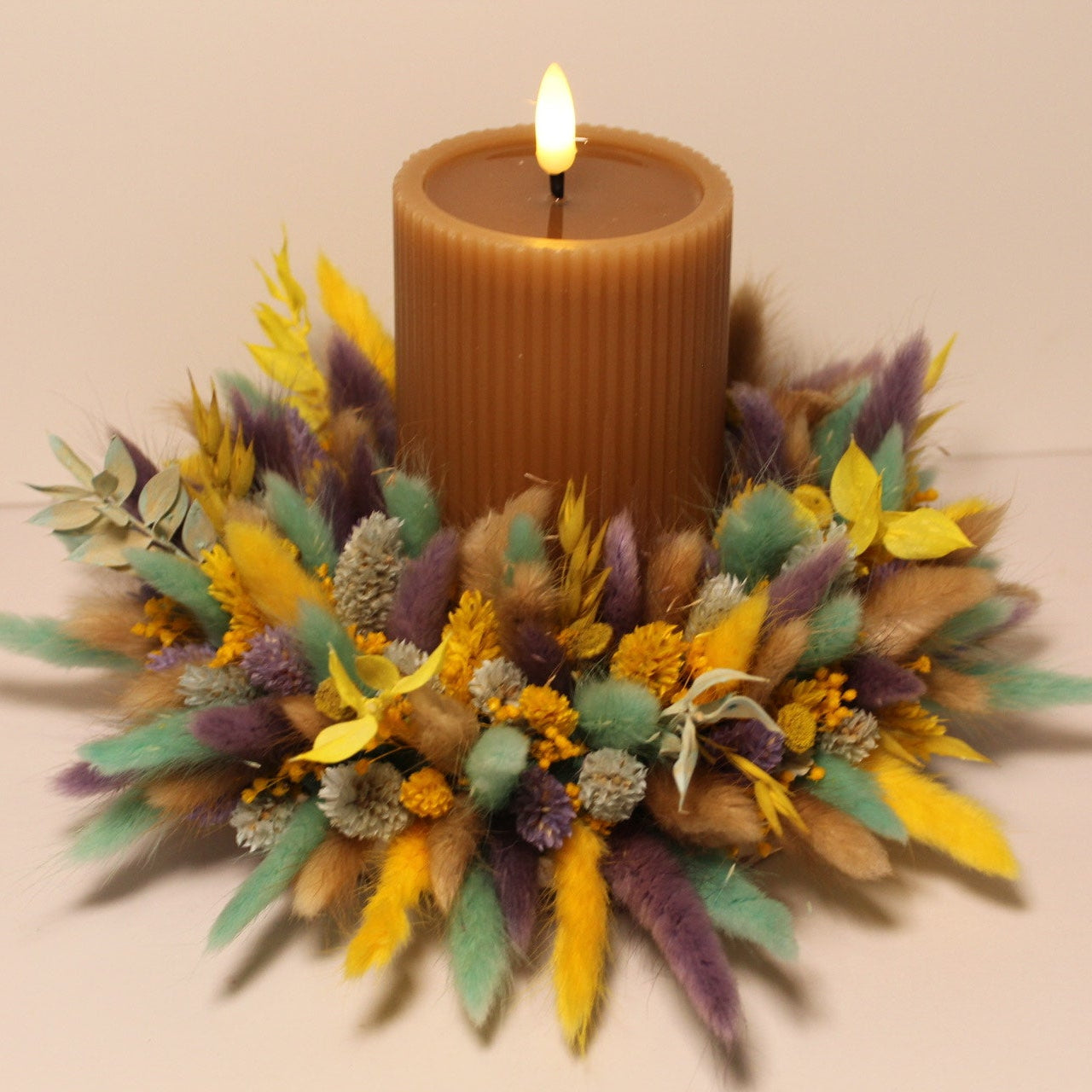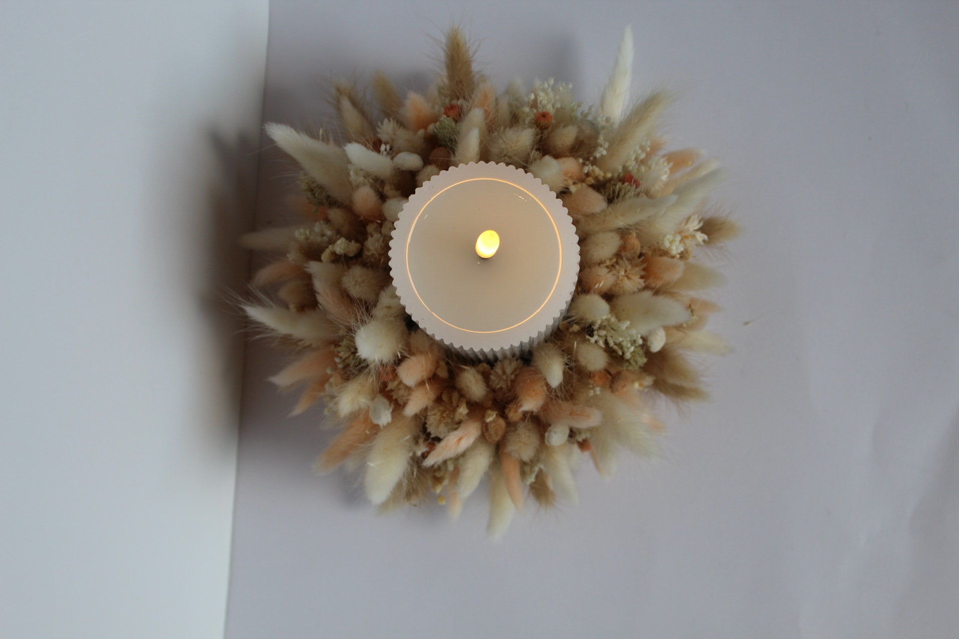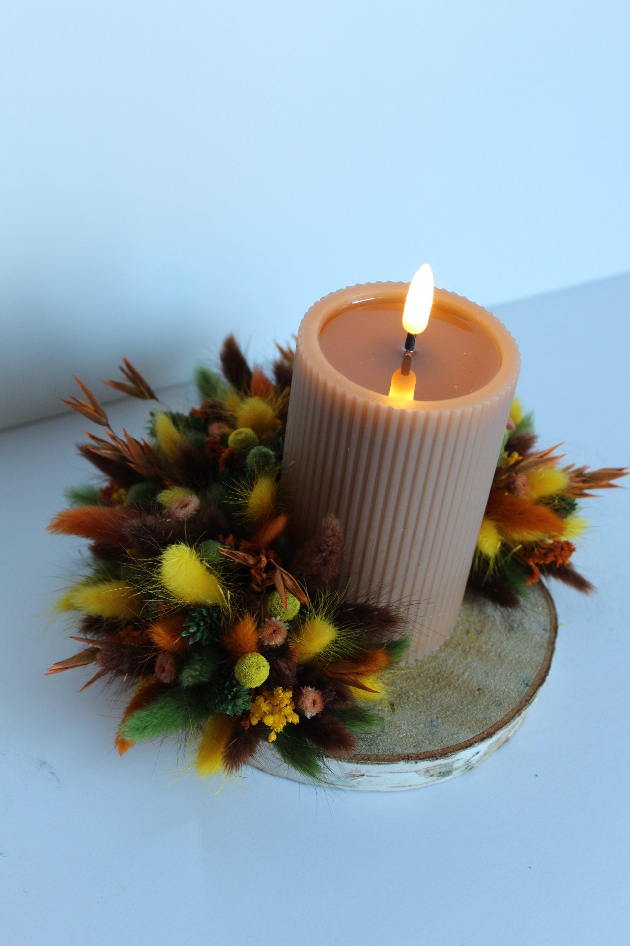 Kaars in droogbloemen, een sfeervolle kaars omringd door met zorg geselecteerde en handgeschikte gedroogde bloemen. Dit bloemstuk brengt warmte, rust en een vleugje natuurlijke charme in huis. Perfect als tafeldecoratie, cadeau of om een gezellig hoekje extra bijzonder te maken. De bloemen verwelken niet en de kaars is eenvoudig te vervangen, waardoor je er lang van kunt genieten.