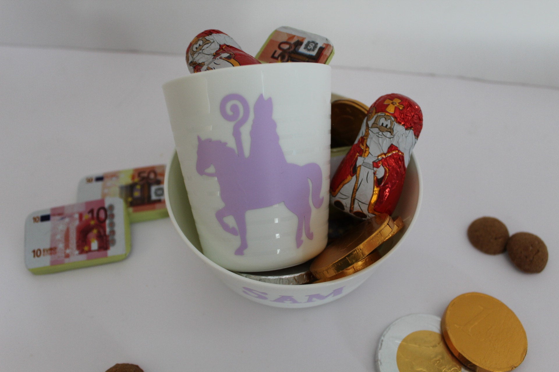 Maak sinterklaas extra speciaal met ons gepersonaliseerd setje van een kommetje & beker. Perfect voor chocolade, pepernoten of snoepjes van de Sint!